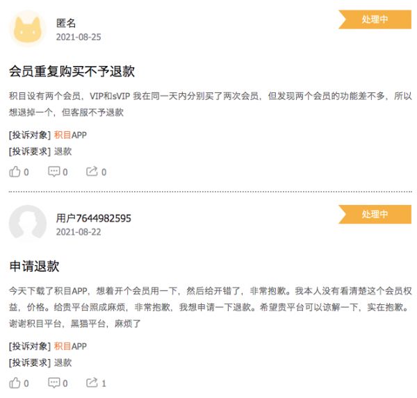 在黑猫投诉上,充斥着许多用户对积目APP乱扣费的投诉。有人称买了积目APP的VIP与SVIP会员后,发现两个会员功能差不多想退掉,客服不予退款。也有人称购买了积目APP的付费功能后,仍需要再次开通,联系客服依然不给解决。