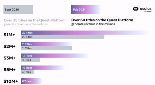 因此,适合VR产品的消费内容可能更多还是益智、探索、影视、大型游戏等相关品类,尤其是游戏,比如魔兽、使命召唤等大型游戏。从目前来看,Facebook在VR产业上的突出表现也与游戏内容相关。Facebook在2020年Q4财报电话会话中透露Quest平台超60款游戏收入超100万美元。而Quest平台上线两年的253款游戏评论数超25万条,赶超2016年推出的Oculus PC平台评论数总和。