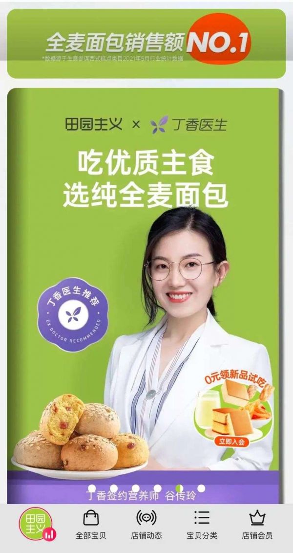 田园主义天猫旗舰店的全麦面包的详情介绍里,多次突出“轻脂轻卡轻负担”“拒绝蔗糖、低脂肪、高膳食纤维”“热量更低、饱腹更强”“健身教练都在为它打call”等描述。旗舰店首页的广告海报上,还贴有“丁香医生推荐”的标签。此前,田园主义与丁香医生曾联名推出过一款全麦面包礼盒。