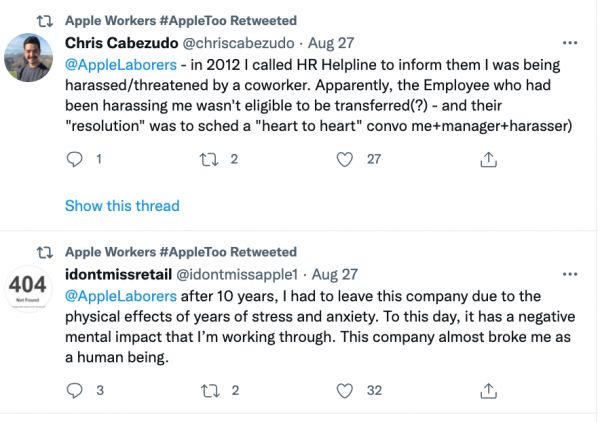 Apple Too倡议发出后,目前已经有很多人在社交平台上站出来吐槽自己的在苹果的工作经历。
