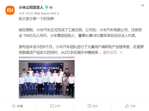 9月1日上午,小米通过小米公司发言人微博宣布,小米汽车正式完成了注册,公司名为小米汽车有限公司,注册资金100亿元人民币,小米集团创始人、董事长兼CEO雷军亲自出任法人代表。