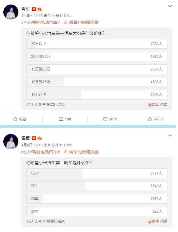 关于小米的首款车型,其实雷军在4月份就发起过3次投票。在价格方面有1.7万人参与了投票,有6604人希望小米汽车的首款车型定价在10万元以内,有4693人希望价定价在10万到15万元之间。在车型方面,有1.5万人参与了投票,其中有6543人希望小米的第一辆车是轿车,有6171人希望小米的第一辆车是SUV。