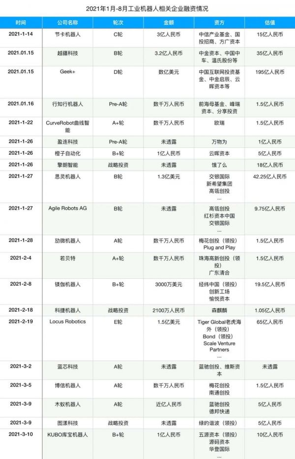 以下是2021年1~8月国内工业机器人相关企业融资情况列表。