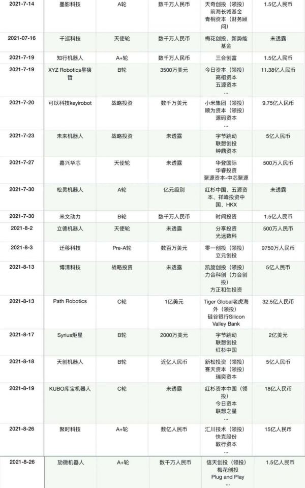 投资人说&科创最前线根据IT桔子、视野数科等数据渠道粗略统计,2021年1月1日至2021年8月31日期间,工业机器人领域发生了70起融资事件。