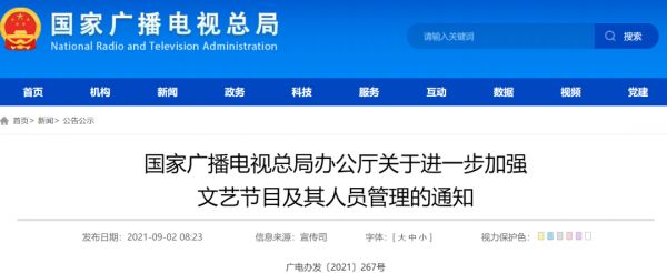 9月2日,国家广播电视总局发布《国家广播电视总局办公厅关于进一步加强文艺节目及其人员管理的通知》,要求广播电视机构和网络视听平台不得播出偶像养成类节目,不得播出明星子女参加的综艺娱乐及真人秀节目,同时坚决杜绝“娘炮”等畸形审美。