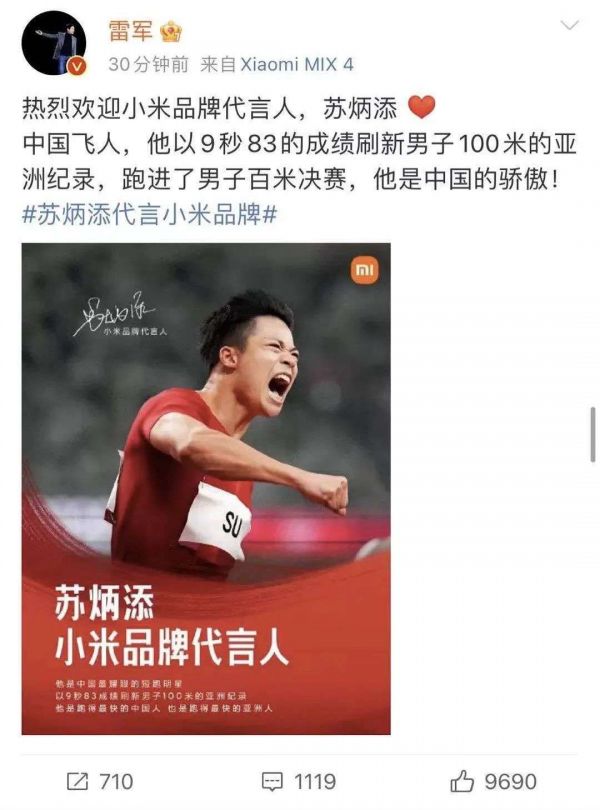 在奥运会结束后的第一天,创造中国田径历史的苏炳添,正式成为小米品牌代言人。