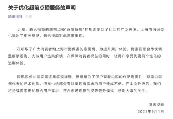 近期,腾讯视频的超前点播“逐集解锁”的规则受到了社会的广泛关注,上海市消保委也提出了相关意见,腾讯视频对此高度重视。