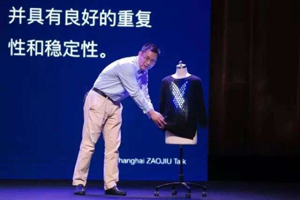 接下来我跟大家介绍这个纤维的第二大功能,如果我把它做成衣服,这件衣服是可以变色的。
