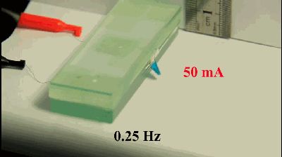 我们可以想象用它做成一个翅膀,只用接通一股很小的电流,这个翅膀就可以煽动起来,断电之后它又回到原位。这个过程可以反复进行,而且翅膀煽动的频率可以通过电流频率来控制。
