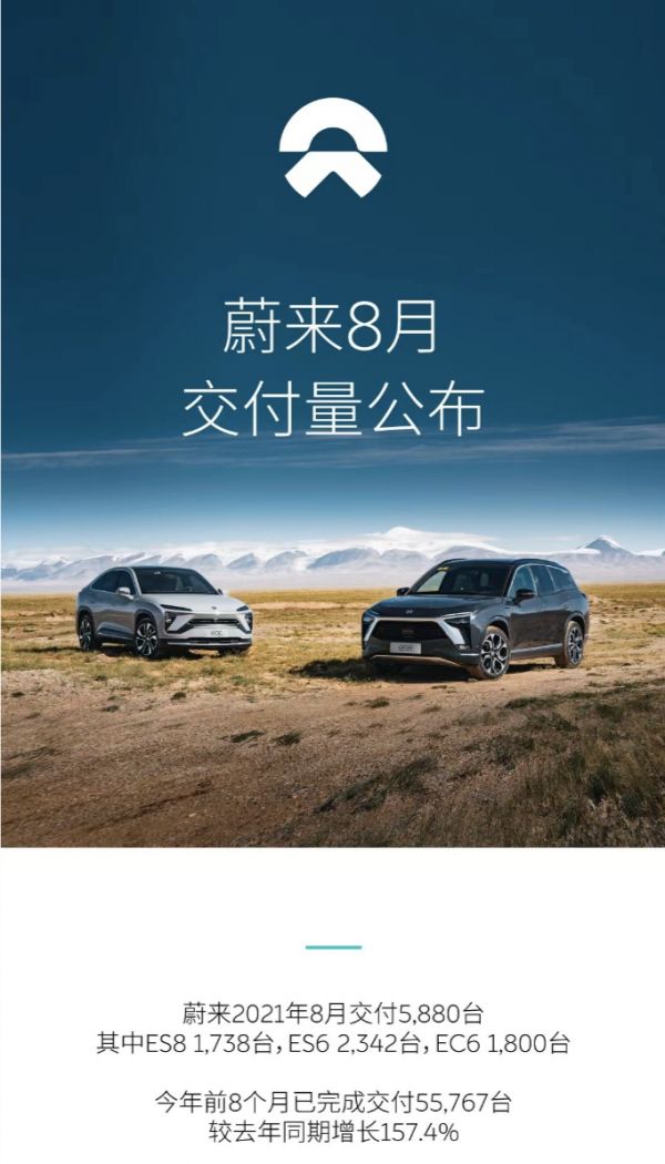 蔚来汽车8月交付量为5880台,同比增长157.4%,但环比7月份7931台的交付数量大幅环比下滑约26%。