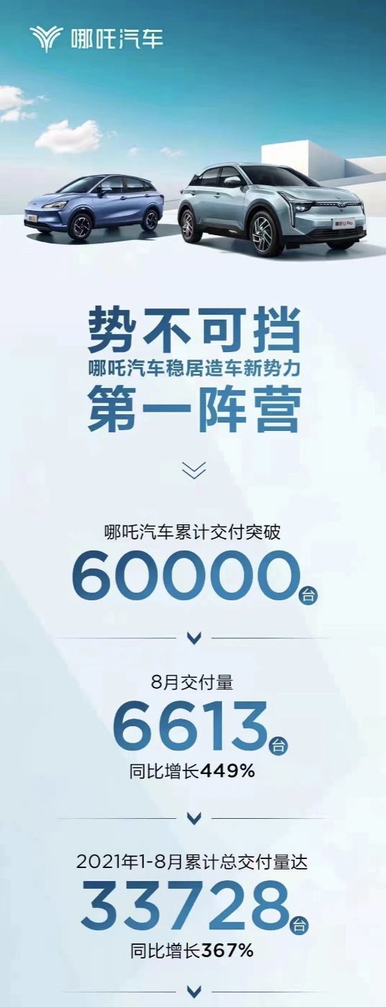 根据哪吒汽车公布的8月份数据,当月共交付6613辆,同比增长449%,环比今年7月增长约10%。