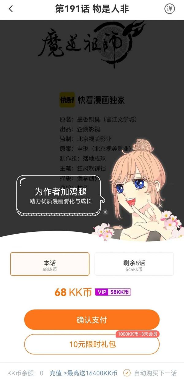以《魔道祖师》为例,在已更新的202话中有28话可免费阅读,其余均需花费68KK币(VIP花费58KK币)才能阅读,而1KK币=0.01元,也就是说,阅读完目前全部更新的漫画需要117.64元,即便是尊贵的VIP也要在每月花费15元的基础上,再花费100.34元。更何况,这样一部漫画仅每周一更新,直到现在也刚刚画完原著一半的内容。