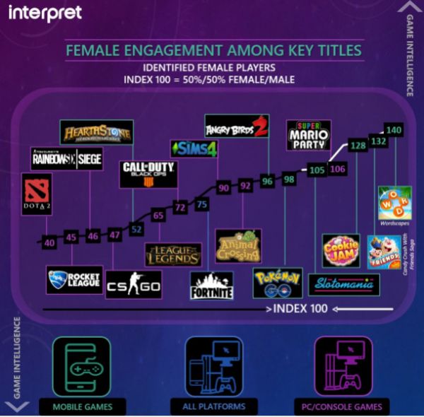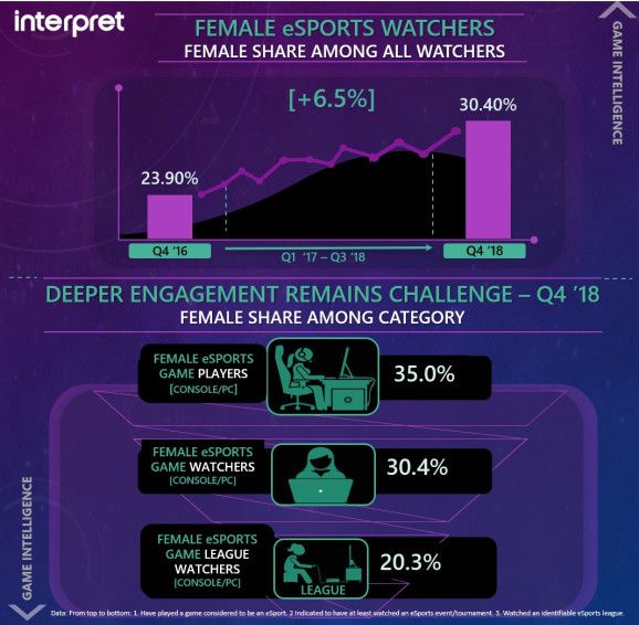 游戏主机/PC上的电竞选手中,只有35%是女性,而女性观众的比例仅为30%,观看电竞赛事的女性用户数量仅占20%。不过休闲游戏(主要在移动设备上)的女性比例高达66%。Interpret表示电竞女粉丝的增长可能是手机游戏的普及而带动的。以Skillz(提供移动电竞游戏的平台)为例,2018年平台前10大收入者中有7名是女性。