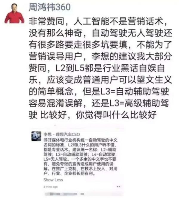 360创始人周鸿祎转发李想的观点并表示赞同,他认为人工智能不是营销话术,没有那么神奇,自动驾驶无人驾驶还有很多路要走很多坑要填,不能为了营销误导用户。L2到L5都是行业黑话自娱自乐,应该变成普通用户可以望文生义的简单概念。