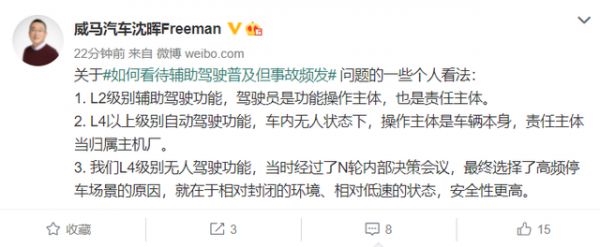 威马汽车创始人沈晖则认为,L2级别辅助驾驶功能,驾驶员是功能操作主体,也是责任主体;L4以上级别自动驾驶功能,车内无人状态下,操作主体是车辆本身,责任主体当归属主机厂。