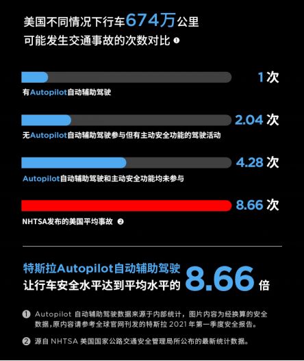 虽然Autopilot导致了一些交通事故,但特斯拉方面此前也作了一次数据对比:根据NHTSA公布的数据,在美国每行车674万公里,平均会发生8.66次事故。而这个数据,在使用了Autopilot的特斯拉车主中仅为1次;没有使用Autopilot但有主动安全功能参与的驾驶中,事故约为2次。也就是说,特斯拉的Autopilot让行车安全水平达到平均水平的8.66倍。