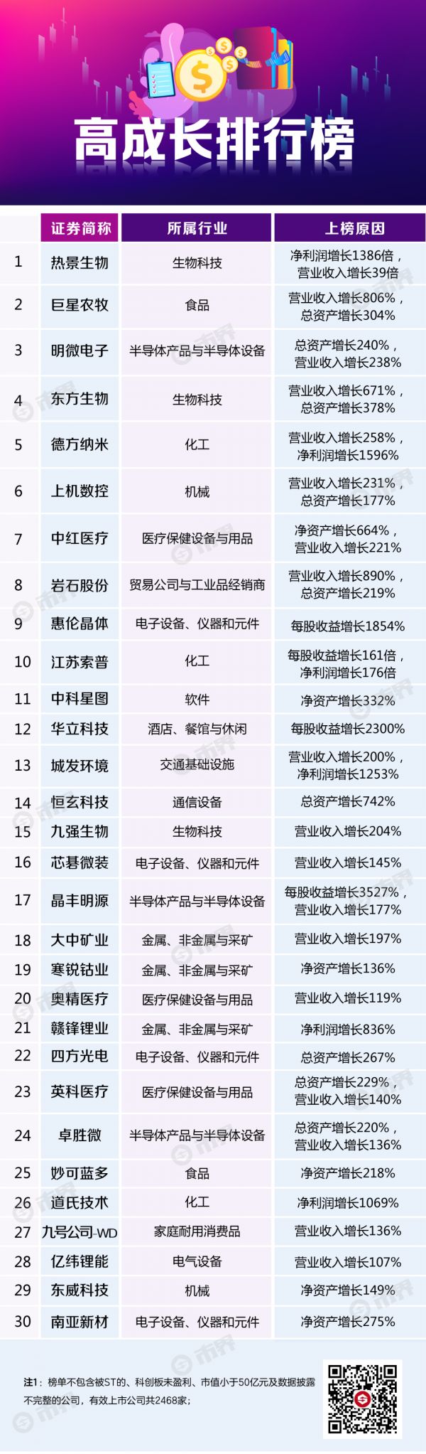 上市公司高成长排行榜,以资产、收入、利润等指标的增速为基准,排除ST公司、*ST公司、科创板未盈利公司以及市值50亿元以下公司。在2468家数据有效的公司中,选取了前30家。