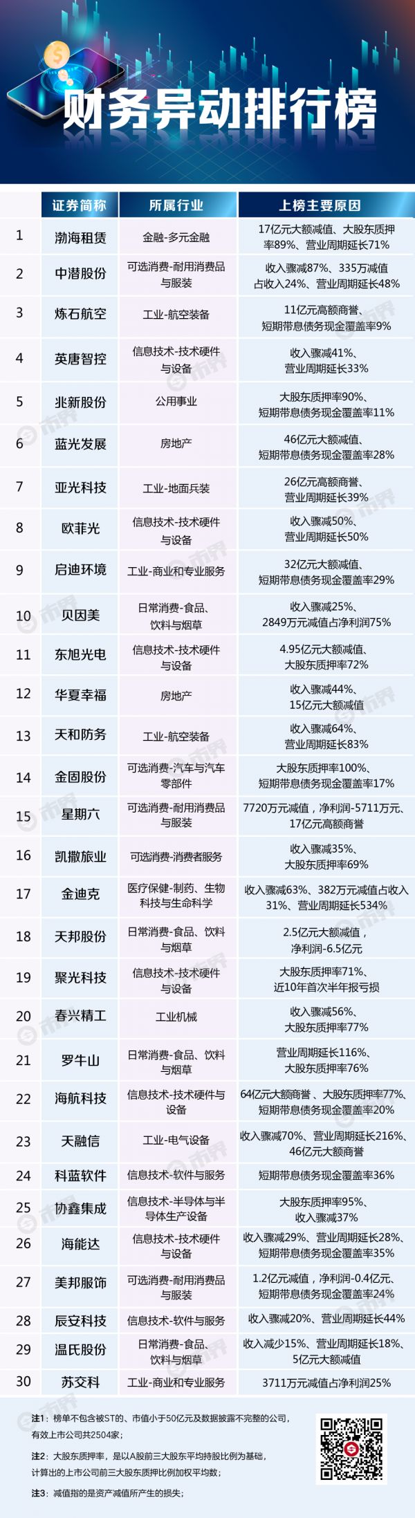 整体来看,由于去年同期受疫情影响,业绩有大面积的下滑,今年整体的同比情况良好,业绩回升的上市公司居多。但榜单中排名前30的上市公司中,大部分都存在收入同比大幅下滑、大额资产减值损失、大股东质押率偏高、周转天数同比大幅延长、商誉占比较大等问题。