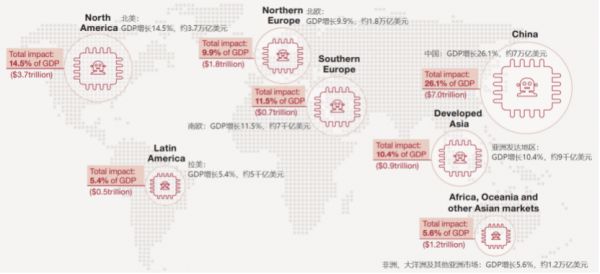 (一)中国的经济结构在人工智能时代具有独特优势。人工智能技术与应用门槛高,领先国家将获得经济增长的先发优势。到2030年,人工智能可推动中国GDP增长26.1%、北美GDP增长14.5%,南欧、亚洲发达地区、北欧居后,分别为11.5%、10.4%、9.9%,非洲等发展中国家及拉美地区仅为5.6%和5.4%。