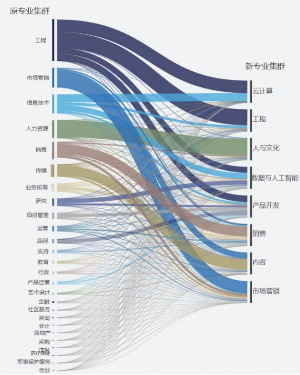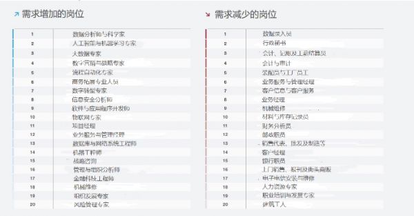 (二)新增就业多为新职业或发生重大变化后的现有职业。20个经济体中共有99个需求持续增长的工作岗位,且这些工作技能相似,进一步形成不同的专业集群,向云计算、工程、数据与AI、文化与内容、销售聚集。从就业岗位看,数据分析师、AI工程师、大数据工程师、自动化工程师、软件工程师等需求将大幅增加,机器操作员、行政人员、会计、图书管理员等重复性需求将缩减。