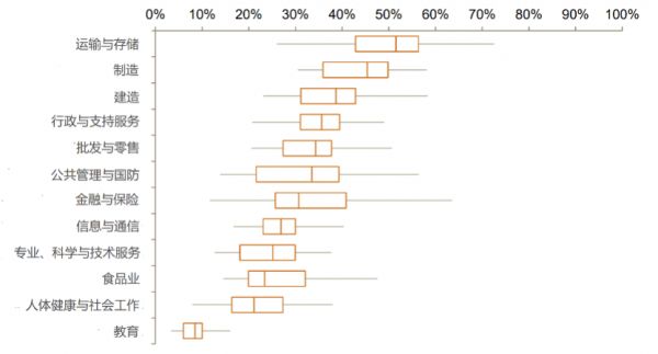 (三)新技术对不同行业的影响显著不同。从行业看,交通业、制造业、建筑业、零售业就业替代将比较显著。2030年以前,金融服务将受到较为明显的冲击,而对交通业的冲击将体现在自动驾驶技术成熟以后。教育业、医疗、饮食等行业受到的影响则相对微弱。