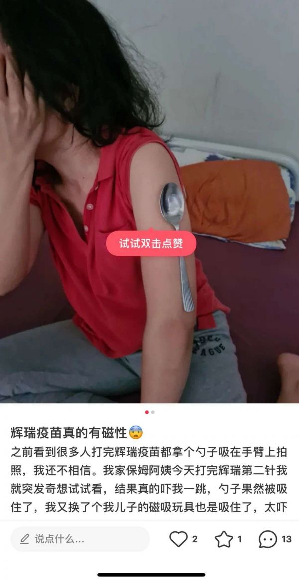 最近,小 X 书上冒出了一些关于辉瑞新冠疫苗的帖子。一些用户宣称,自己在打完疫苗后,胳膊上的注射处产生了磁性,甚至可以吸附铁勺。在他们发出的照片里,接种过疫苗的大臂上紧贴着一把金属勺,旁边没有任何支撑。为了证明疫苗真的能给人加磁,有人还做了左右胳膊对比,没打过疫苗的胳膊对勺子毫无反应。
