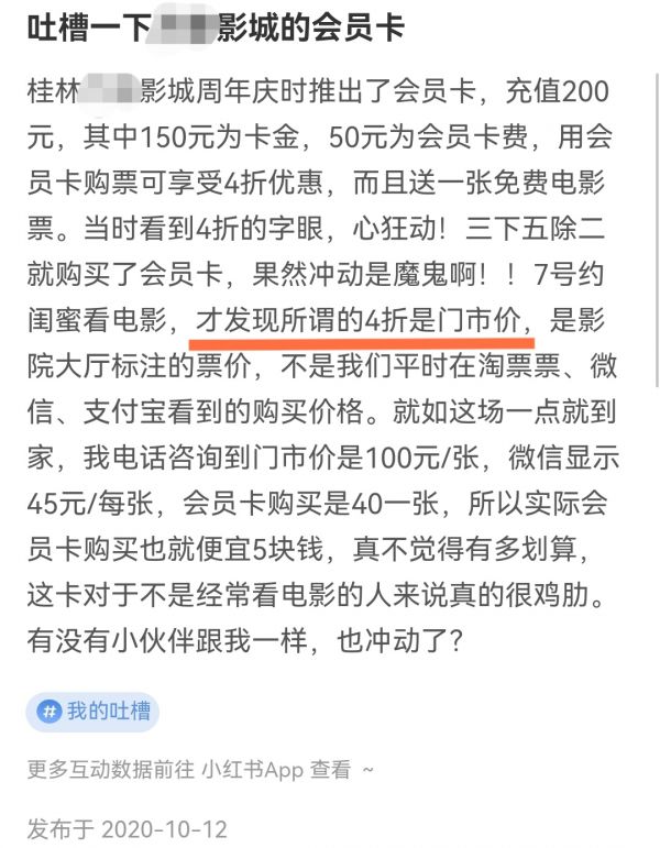 而从一些特别擅长精打细算的观众反馈中,我们也看出了影城会员卡在优惠设计上可能存在的漏洞。比如,在经验分享平台上搜索“影城会员卡”这个关键词,不难找到相关的“吐槽帖”。
