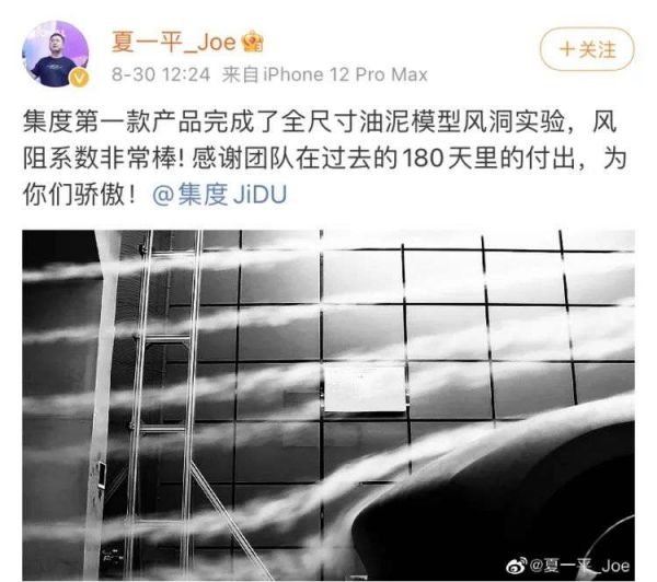 在小米汽车消息发布的两天前,集度汽车CEO夏一平在微博中晒出了首款汽车产品风洞图,这意味着集度首款产品的造型已经完成。这是集度宣布造车后的第182天,首款产品造型历时6个月时间。