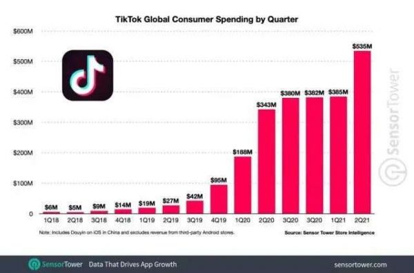 不过,即便遭遇监管打击与巨头的抄袭几家,Tik Tok一路高歌猛进。根据Sensor Tower的最新数据,TikTok 是2021 年上半年全球下载量最大、收入最高的非游戏应用程序。今年第二季度,TikTok 的消费者支出实现了自 2020 年第二季度以来最大的环比增长,从上一季度的 3.847 亿美元攀升 39% 至 5.346 亿美元。