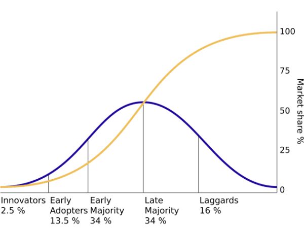 现在,先从很小的地方去想象一下这项技术,然后不断发展,相信它被越来越多的人采用,融入到文化当中,随着采用曲线的每一次指数级飞跃而传播得越来越广泛。这就是被历史一次次证明过的创新曲线的扩散方式。
