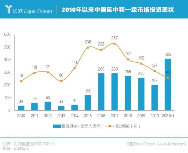 经历了2019年的“资本寒冬”以及2020年新冠疫情,2021年碳中和行业在“3060规划”主旋律的引导下进入高增长期,碳中和一级市场仅半年的投资规模就达到历史新高(405.29亿元人民币)。