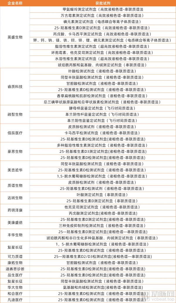 试剂同质化水平高是临床质谱赛道不可忽视的问题。多数串联质谱企业均聚焦在维生素检测、新生儿筛查、药物浓度监测场景。表格中,光是25-羟基维生素D检测试剂盒就有14款。
