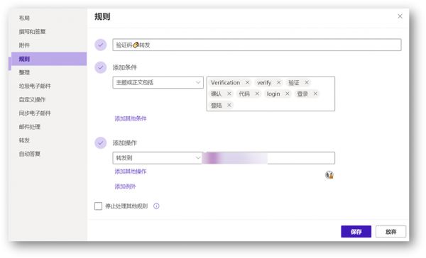 邮件规则那时挽救我于水火之中。几乎所有邮箱在转发全部邮件选项之外,还在邮件规则中提供了根据设定规则转发的功能。我们可以利用邮件规则,将含有特定关键词,来自特定地址的邮件转发到我们的主邮箱中。下图中,我设置了将含有验证码的邮件转发到主邮箱的选项: