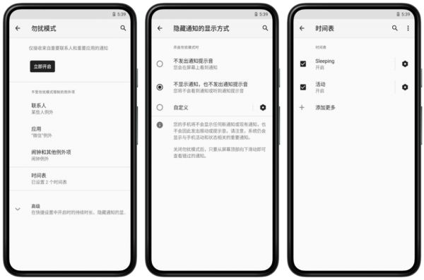 移动设备大都内置了「Do not Disturb」功能。以 Android 为例,我们可通过设置 App 搜索「勿扰」,或者长按通知栏的开关唤出勿扰设置。下图中,我设置了当睡眠或有日历活动时,除了微信、闹钟外的所有通知都静音且不显示。