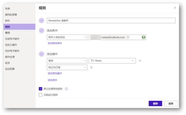使用了邮件别名一节中 hi+<关键字>@gmail.com 的方式注册网络服务,相当于对邮件来源提前进行了筛选。不同类型的邮件将会有不同的收件地址,我们可以利用这一点配置邮件规则。比如说将所有招聘类邮件全部移动到垃圾箱,将 Newsletter 类邮件标记已读并移动到某个文件夹: