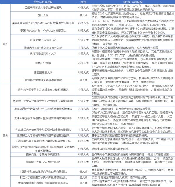 脑机接口技术涉及多学科交叉融合,当前的研究者以科研院所和高校为主。国内外很多知名大学都已经开展了脑机接口方向的前瞻性研究,并取得了丰硕的研究成果。因受到技术、伦理等多重限制, 侵入式脑机接口领域的研究投入小于非侵入式脑机接口,研究机构和企业数量也远少于非侵入式脑机接口。