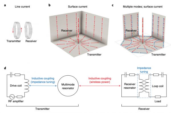 实验中,研究人员利用 M-QSCR 技术在整个尺寸为 3m×3m×2m 的试验室中实现了电力的高效输送,他们使用由导电表面和集电容器组成的共振结构,以适应具有相互独特的振荡表面电流模式的多个共振模式。