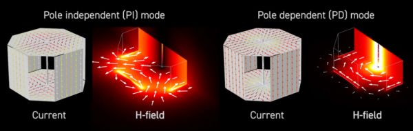 当 PI 模式被激发时,电流仅流经墙壁、天花板和地板,并在墙壁附近产生强磁场分布;相反,PD 模式会产生一个流过中心极的电流,该电流会产生一个磁场,该磁场在中心极周围循环,在中心极附近最强。