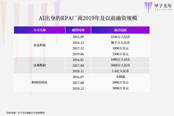 在切入RPA领域之前,来也、达观、阿博茨科技均累计融资超过2亿人民币,在AI领域有先发优势。陈运文告诉「甲子光年」:“从AI做RPA相对容易,但从RPA做AI很难,因为研发投入巨大,要下很大决心才行。”