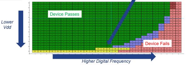 通过不断改变输出的VDD与Scan Shift频率来查看所有测试向量的输出结果,当VDD越低频率越高时,越容易发生失效。在实际的Shmoo测试案例中,泰瑞达的UltraFLEXplus具有更稳定的供电电源,这意味着可获得更高的边界良率,使得芯片更加贴近于真实的本征。这样一来,在实际产品中,我们对于芯片的实际工况便能够得到一个更加准确的推断,知道哪些情况是可以工作的,哪些情况是不能工作。总的来说,更好更稳定电源不仅能够提升良率,还能够认识芯片在真正工况下的工作状态。