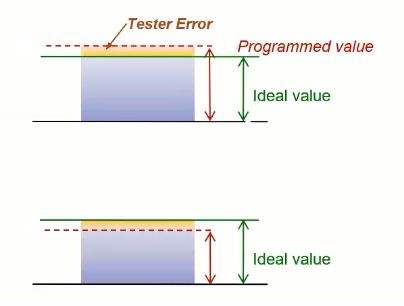 然而,在实际的测试中,没有一款测试机是完美的。实际操作中,芯片会经常性产生误差,一种方式是尝试编程稍高于芯片预设值的电压,由于考虑芯片的误差及所有的损耗,需要保证芯片引脚上的电压依然高于预期值。通过这种测试方法,即使仪表波动到最低的电压情况下,质量好的器件仍然可以pass,从而获得更高的良率。
