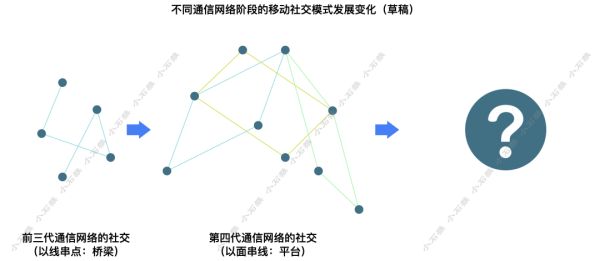 第四代通信网络阶段,社交的模式是用面去融合不同的线,这些面有的存活下来了,也有沉没的,最终形成一个个平台。多样化需求的面下,便捷的提供跨越人际关系的社交服务,这些点之间可能是熟悉的,也可能是陌生的。