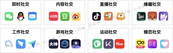 这一代社交之争体现在了智能手机的APP之争,抢夺用户流量的炮火和金钱频繁地轰炸在这里。经过十几年的发展,进入到上图示例的这个格局。从社交人群关系的维度,大致可以分为熟人的社交、陌生人社交和圈层的社交。