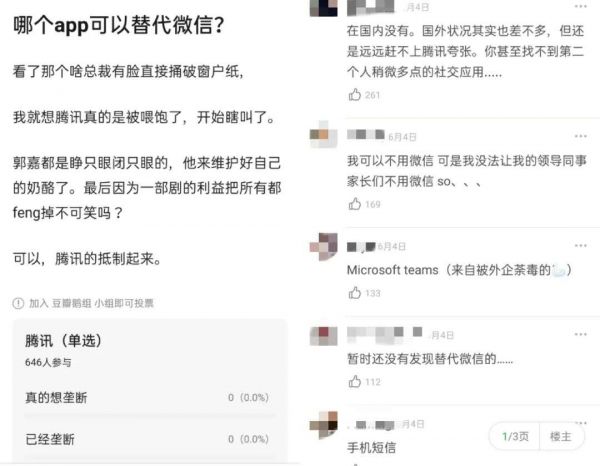 “我可以不用微信,但我没法让我的领导同事家长们不用微信……”今年6月,豆瓣的著名产瓜小组“鹅组”,有人发帖讨论《哪个APP可以替代微信》,想要逃离微信的人不在少数,他们开始觉得,用微信不是因为功能,而是因为所有人都在这里。