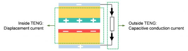相关研究已经证明, TENG 中的内部电路是由位移电流决定的,而在外部电路中观察到的电流是电容导通电流。如下图所示,内部电路和外部电路在两个电极处汇合形成一个回路。因此,位移电流是电流产生的内在物理核心,电容导通电流是位移电流的外在表现形式。
