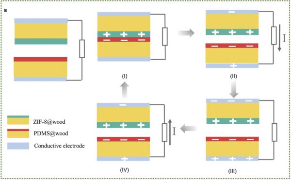 研究人员使用 ZIF-8(一种金属有机框架材料)颗粒和聚二甲基硅氧烷(PDMS)对两块木板进行了表面改性(表面改性是指,在保持材料或制品原性能的前提下,赋予其表面新的性能,比如亲水性、抗静电性等),因此木板表面的化学和形态变化增加了木材在周期性“接触-分离”中失去(ZIF-8@wood)或获得(PDMS@wood)电子的能力,从而产生了电量。