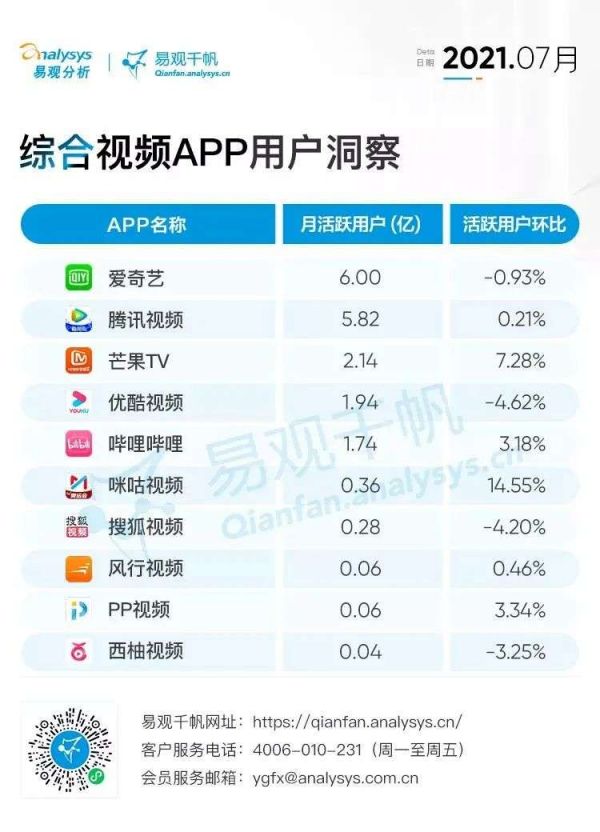 据易观千帆数据,截止2021年7月底,芒果TV月活跃人数环比增长7.28%至2.14亿,以高出优酷0.2亿的人数拿下了行业TOP3。