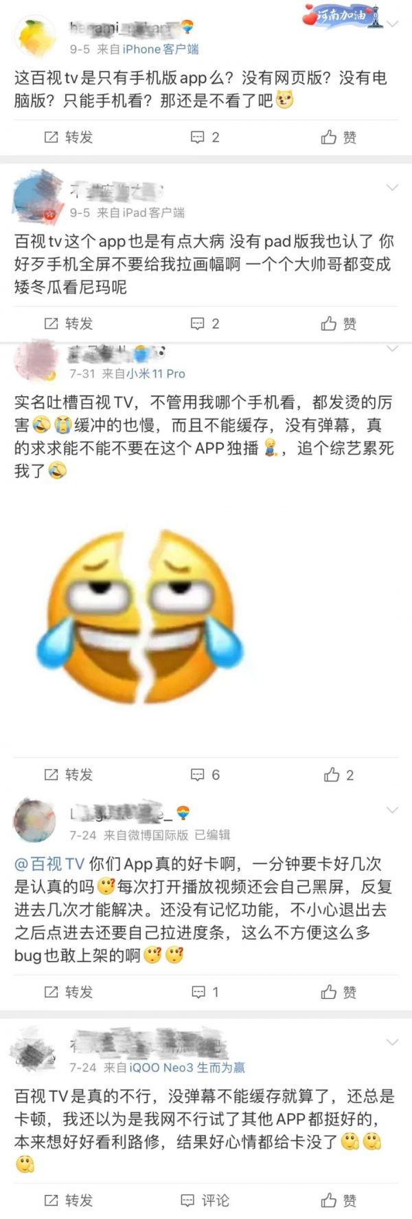 最后,随着移动互联红利衰竭以及视频行业成熟,各平台的覆盖内容、功能和设计的重叠度持续提升,用户体验在平台留存上的重要性越来越突出。但文娱君在社交平台搜索“百视TV App”浏览到的使用反馈却以负面为主,主要槽点包括没有pad版,手机全屏观看拉画幅、没有弹幕功能、缓存功能、播放记忆功能,播放卡顿等。