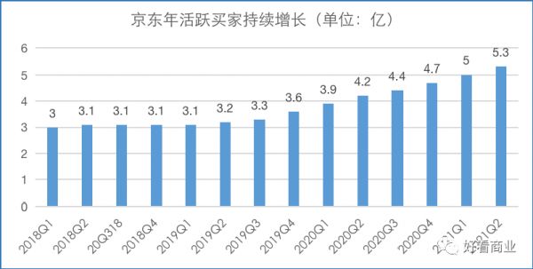 收入保持增长的同时,京东的年活跃用户也在快速增长。截至2021年6月30日,京东过去12个月的活跃购买用户数达5.319亿,较2020年同期的4.174亿增长27.4%。