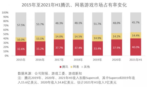 腾讯和网易已经占据56.5%的游戏市场,网易自2017年以后市场份额就始终保持在14%~15%之间。相比之下腾讯 (除去Supercell的部分)在2019年经历了一个低潮之后,2021年上半年的市场份额上升到40%。